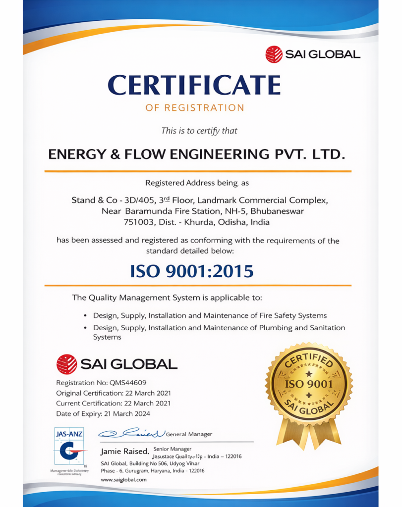 ISO 9001:2015 certified fire safety engineering company delivering reliable fire protection, prevention, plumbing, and maintenance solutions across India.